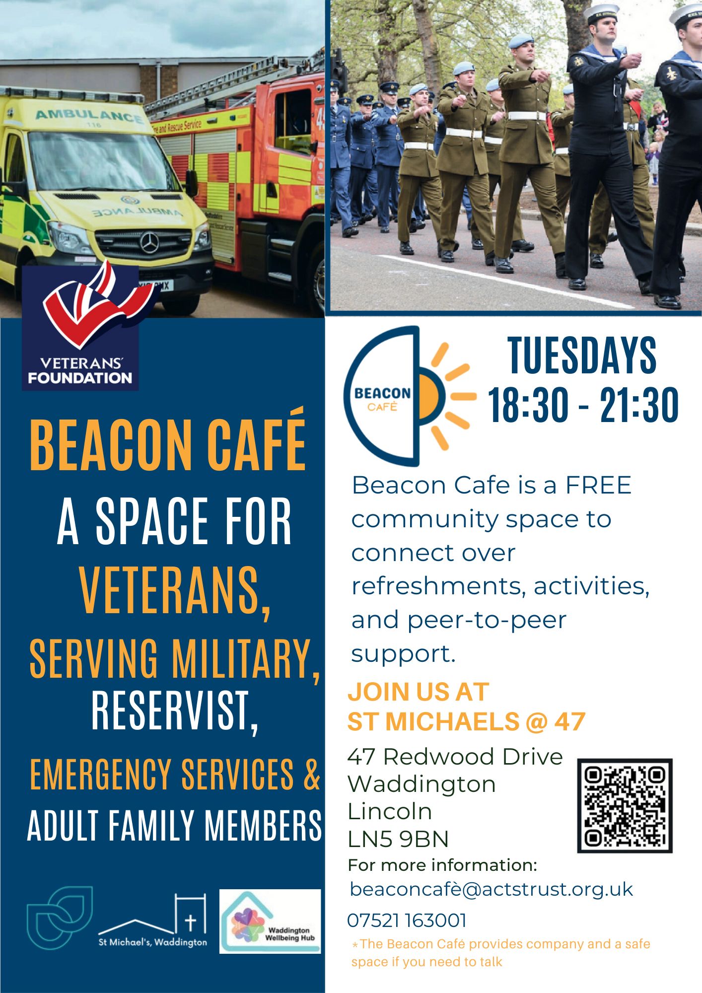 The Beacon café is a wellbeing and connection space for Veterans, Serving military, Emergency services workers and adult family members, it is a place to chat and connect with like minded people, hosted by trained volunteers who have experience within these services.